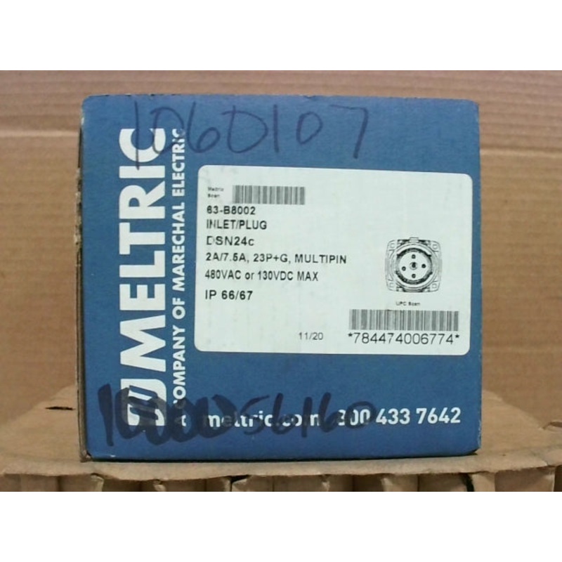Meltric 63-B8002 Inlet Plug 2-7.5A 480VAC 130VDC E1673 23P+G DSN24C