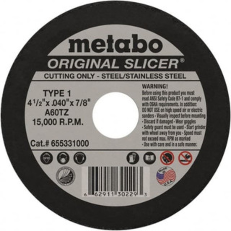 Metabo 4-1/2 x 0.04, 7/8" Hole 60 Grit Aluminum Oxide Cutoff Wheel Medium Grade, 15,000 Max RPM, Use with Angle GrindersManufacturer Part #: 655331000S/N: 63772693UNSPSC: 23131503UPC: 662911302293(Minimum Order Quantity=1, Package Quantity=1)Specifications
