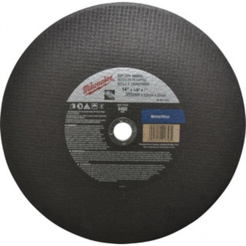 Milwaukee 14 x 1/8, 1" Hole 24 Grit Aluminum Oxide Cutoff Wheel Very Coarse, Reinforced, 5,400 Max RPM, Use with Angle GrindersManufacturer Part #: 49-94-1475S/N: 89869911UNSPSC: 23131503UPC: 045242218561(Minimum Order Quantity=1, Package Quantity=1)Specif