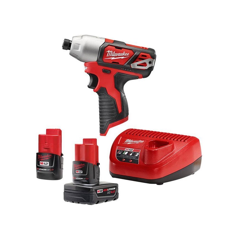 Milwaukee 48-59-2424-2462-20 M12 12-Volt Lithium-Ion 4.0 Ah and 2.0 Ah Battery Packs and Charger Starter Kit w/ 1/4 in. Impact DriverThe Milwaukee M12 XC High Capacity REDLITHIUM Battery is designed with superior pack construction, electronics and performance to optimize work per charge and work over pack life. It offers 4.0 Amp hours of runtime. with built-in Milwaukee durability, this battery runs cooler and performs in climates below 0F/minus 18C. Managed by Milwaukees exclusive REDLINK Intelligence, the battery features overload protection to prevent users from damaging their cordless power tools in heavy-duty situations, while the discharge protection prevents cell damage. The temperature management system and individual cell monitoring help maximize battery life. Use this REDLITHIUM extended-capacity battery to power all Milwaukee M12 cordless power tools. M12 Cordless 1/4 in. Impact Driver delivers unmatched fastening performance in a lightweight, tool belt portable design. A high performance motor delivers 0-2,500 RPM for increased application speed. Additionally, an on-board battery fuel gauge displays remaining run time.Fuel gauge onboard: displays remaining runtimeRedlink plus intelligence: provides optimized performance and overload protection using total system communication between tool, battery and chargerAll-weather performance: delivers fade-free power in extreme jobsite conditionsVersatility: powers 100+ Milwaukee M12 cordless solutionsResists drainage when not in useFlat-bottom base allows tools to stand upright3-year limited warrantyCompatible with all M12 cordless power toolsDelivers long life and run time with fade-free powerIncludes: (1) M12 Charger (48-59-2401), (1) M12 REDLITHIUM XC4.0 extended capacity battery pack (48-11-2440), (1) M12 REDLITHIUM CP2.0 compact battery pack (48-11-2420) and Includes: (1) M12 in. hex impact driver (tool only) (2462-20)DetailsBattery Power TypeLithium IonCharger IncludedCharger IncludedColor FamilyRedNumber of Total Batteries Included2Power Tool FeaturesNo Additional FeaturesVoltage (V)12 V
