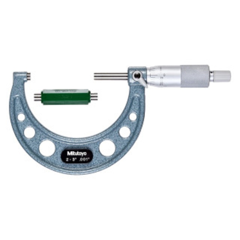 Mitutoyo Enamel Frame Outside Micrometer, 2-3" - 11-689-7 Mitutoyo Model # 103-179 Range: 2-3" Graduation: 0.001" Ratchet Spindle Hammertone baked enamel finished frame. Clear graduations on satin-chrome finish for easy reading. Carbide-tipped anvil and sp