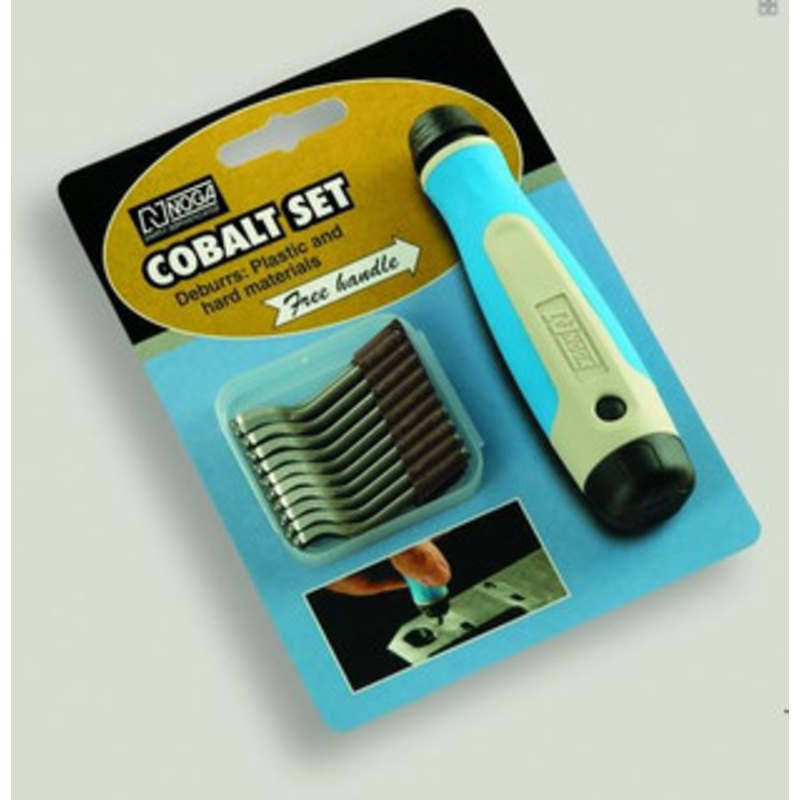 Deburrs: Plastic and hard materials. Set contains: 1pcs. – NogaGrip 1 handle. 20pcs. – 100 cobalt blades.Pack dimensions: 169x117x26mm.