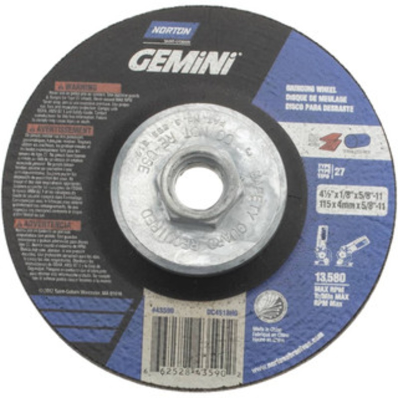 Norton 24 Grit, 4-1/2" Wheel Diam, 1/8" Wheel Thickness, Type 27 Depressed Center Wheel Aluminum Oxide, 13,580 Max RPMManufacturer Part #: 66252843590S/N: 58392010UNSPSC: 23131503UPC: 662528435902(Minimum Order Quantity=1, Package Quantity=1)Specifications