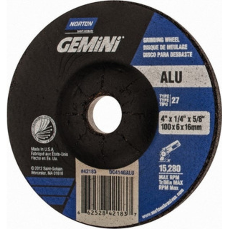Norton 24 Grit, 4" Wheel Diam, 1/4" Wheel Thickness, 5/8" Arbor Hole, Type 27 Depressed Center Wheel Aluminum Oxide, 15,280 Max RPMManufacturer Part #: 66252842183S/N: 58392176UNSPSC: 23131503UPC: 662528421837(Minimum Order Quantity=1, Package Quantity=1)