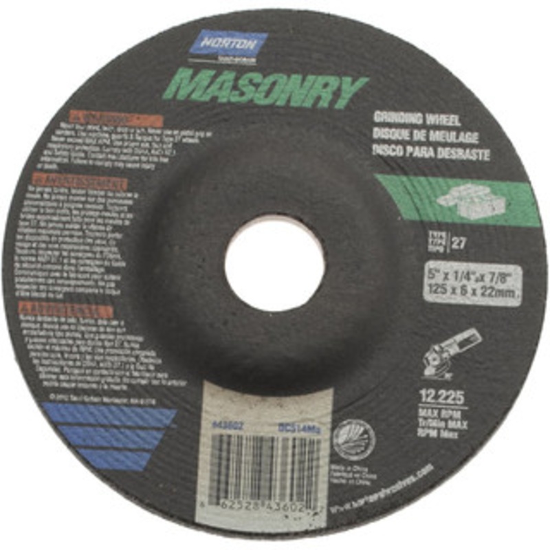 Norton 24 Grit, 5" Wheel Diam, 1/4" Wheel Thickness, 7/8" Arbor Hole, Type 27 Depressed Center Wheel Aluminum Oxide, 12,225 Max RPMManufacturer Part #: 66252843602S/N: 58391780UNSPSC: 23131503UPC: 662528436022(Minimum Order Quantity=1, Package Quantity=1)