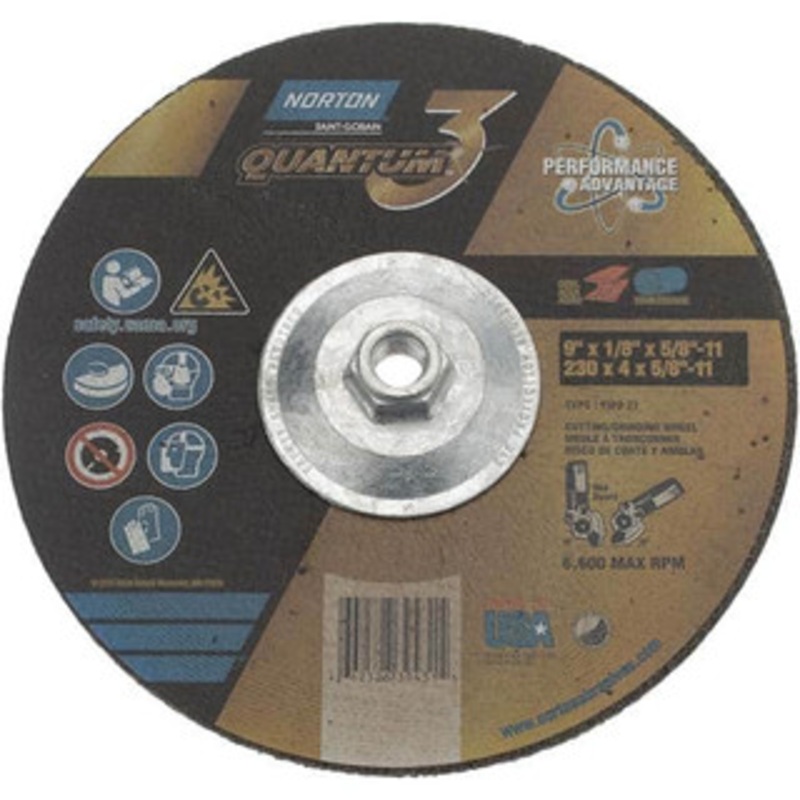 Norton 24 Grit, 9" Wheel Diam, 1/8" Wheel Thickness, 5/8" Arbor Hole, Type 27 Depressed Center Wheel Coarse Grade, Ceramic, Resinoid Bond, 6,600 Max RPM Manufacturer Part #: 66252839431 S/N: 11698271 UNSPSC: 23131503 (Minimum Order Quantity=10, Package Qua