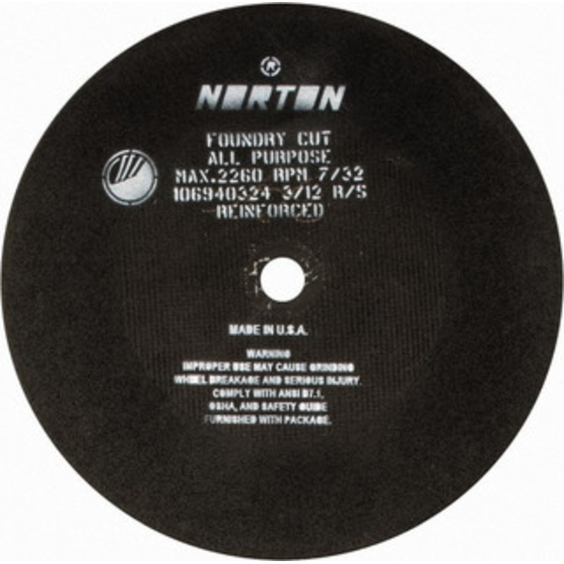 Norton 24 x 7/32, 1-3/4" Hole Aluminum Oxide Cutoff Wheel Reinforced, 2,260 Max RPM, Use with Stationary GrindersManufacturer Part #: 69083125993S/N: 64036403UNSPSC: 23131503(Minimum Order Quantity=1, Package Quantity=1)Specifications:Wheel Diameter (Inch)