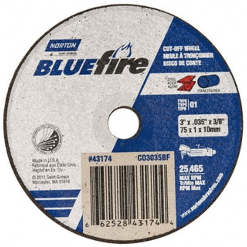 Norton 3 x 0.035, 3/8" Hole 46 Grit Zirconia Alumina Cutoff Wheel Medium Grade, Reinforced, 25,465 Max RPM, Use with Die GrindersManufacturer Part #: 66252843174S/N: 59963215UNSPSC: 23131503UPC: 662528431744(Minimum Order Quantity=1, Package Quantity=1)Spe
