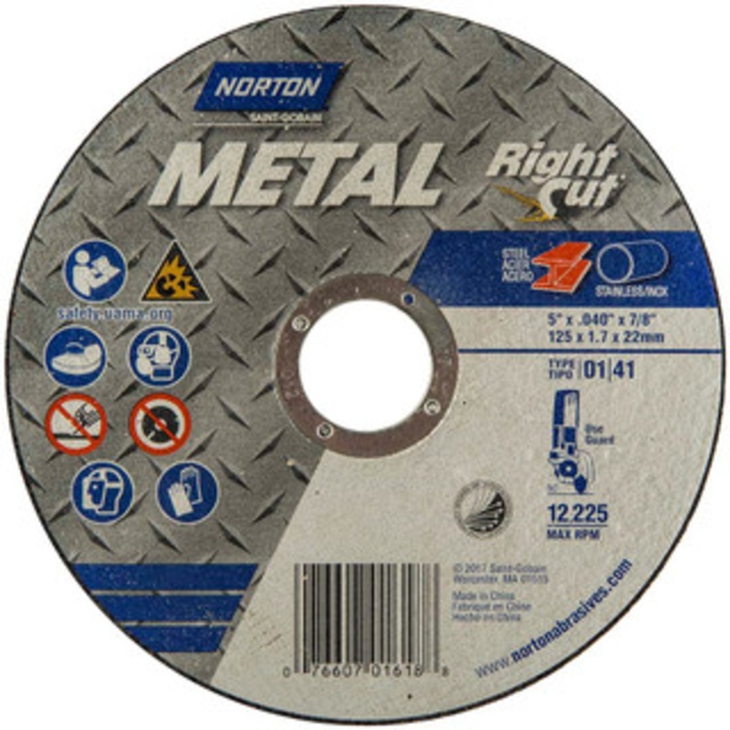 Norton 5 x 0.04, 7/8" Hole 60 Grit Aluminum Oxide Cutoff Wheel Medium Grade, Reinforced, 12,225 Max RPM, Use with Angle GrindersManufacturer Part #: 07660701618S/N: 06049621UNSPSC: 23131503(Minimum Order Quantity=25, Package Quantity=1)(Please order in mul