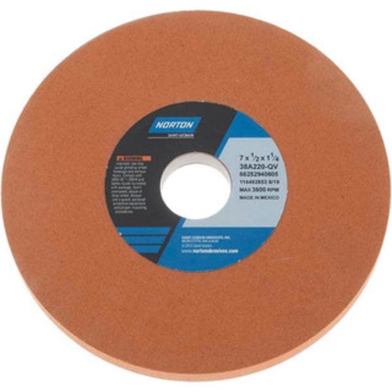 Norton 7 Diam x 1-1/4 Hole x 1/2 Thick, Q Hardness, 220 Grit Surface Grinding Wheel Aluminum Oxide, Type 1, Very Fine Grade, 3,600 Max RPM, Vitrified Bond, No Recess 66252940605 – 01242395