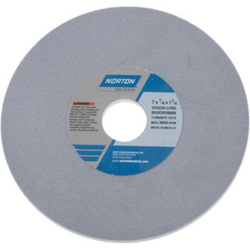 Norton 7" Diam x 1-1/4" Hole x 1/4" Thick, L Hardness, 220 Grit Surface Grinding Wheel Aluminum Oxide, Type 1, Very Fine Grade, 3,600 Max RPM, Vitrified Bond, No RecessManufacturer Part #: 66252939689S/N: 01056357UNSPSC: 23131503UPC: 662529396899(Minimum O
