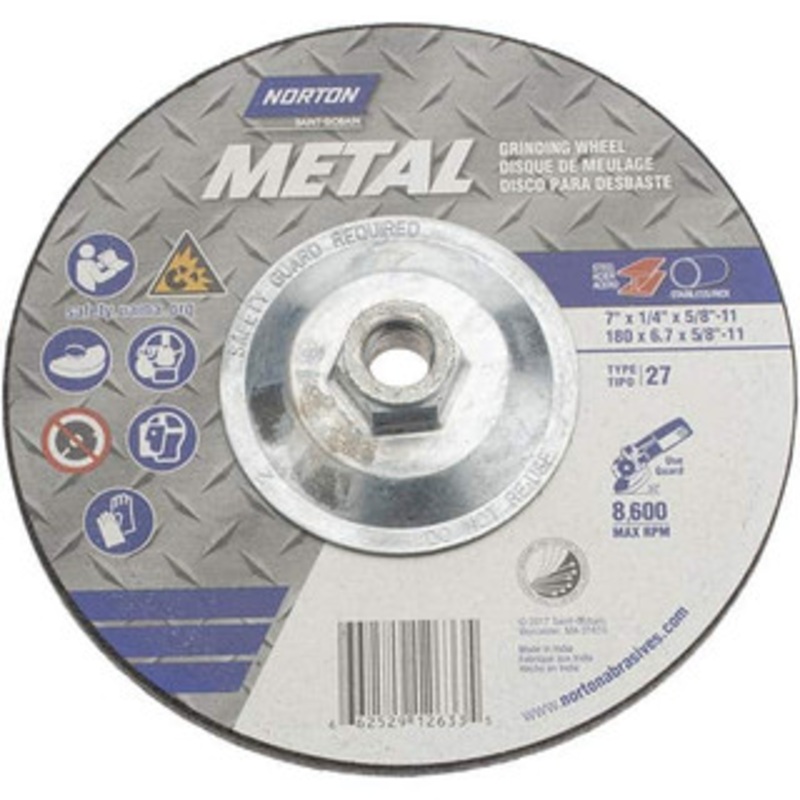 Norton 7" Wheel Diam, 1/4" Wheel Thickness, Type 27 Depressed Center Wheel Aluminum Oxide, 8,600 Max RPM, Compatible with Angle GrinderManufacturer Part #: 66252912633S/N: 09624446UNSPSC: 23131503UPC: 662529126335(Minimum Order Quantity=10, Package Quantit