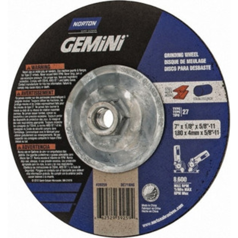 Norton 7" Wheel Diam, 1/8" Wheel Thickness, Type 27 Depressed Center Wheel Aluminum Oxide, 8,600 Max RPM, Compatible with Angle GrinderManufacturer Part #: 66252939259S/N: 99792236UNSPSC: 23131503UPC: 662529392594(Minimum Order Quantity=1, Package Quantity