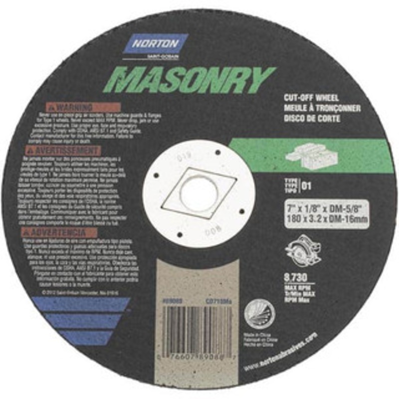 Norton 7 x 1/8, 5/8" Hole 24 Grit Silicon Carbide Cutoff Wheel Very Coarse, Reinforced, 8,730 Max RPM, Use with Circular SawsManufacturer Part #: 07660789088S/N: 06049902UNSPSC: 23131503UPC: 076607890887(Minimum Order Quantity=1, Package Quantity=1)Specifi