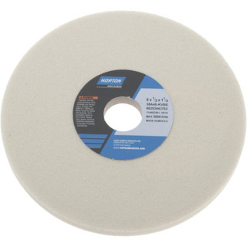 Norton 8 Diam x 1-1/4 Hole x 1/2 Thick, K Hardness, 46 Grit Surface Grinding Wheel Aluminum Oxide, Type 1, Coarse Grade, 3,600 Max RPM, Vitrified Bond, No Recess 66253043762 – 05976444