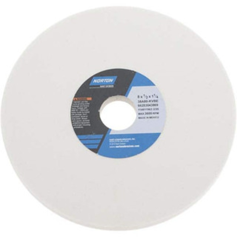 Norton 8 Diam x 1-1/4 Hole x 1/2 Thick, K Hardness, 80 Grit Surface Grinding Wheel Aluminum Oxide, Type 1, Medium Grade, 3,600 Max RPM, Vitrified Bond, No Recess 66253043869 – 05976725