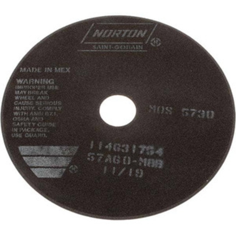 Norton 8 x 1/16, 1-1/4" Hole 60 Grit Aluminum Oxide Cutoff Wheel Medium Grade, 5,730 Max RPM, Use with Stationary ToolsManufacturer Part #: 66253022708S/N: 01833607UNSPSC: 23131503UPC: 662530227083(Minimum Order Quantity=1, Package Quantity=1)Specification