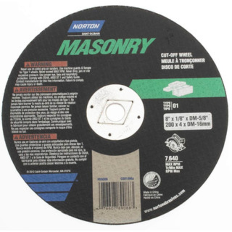 Norton 8 x 1/8, 5/8" Hole 24 Grit Silicon Carbide Cutoff Wheel Very Coarse, Reinforced, 7,640 Max RPM, Use with Circular SawsManufacturer Part #: 07660789086S/N: 06049894UNSPSC: 23131503UPC: 076607890863(Minimum Order Quantity=1, Package Quantity=1)Specifi