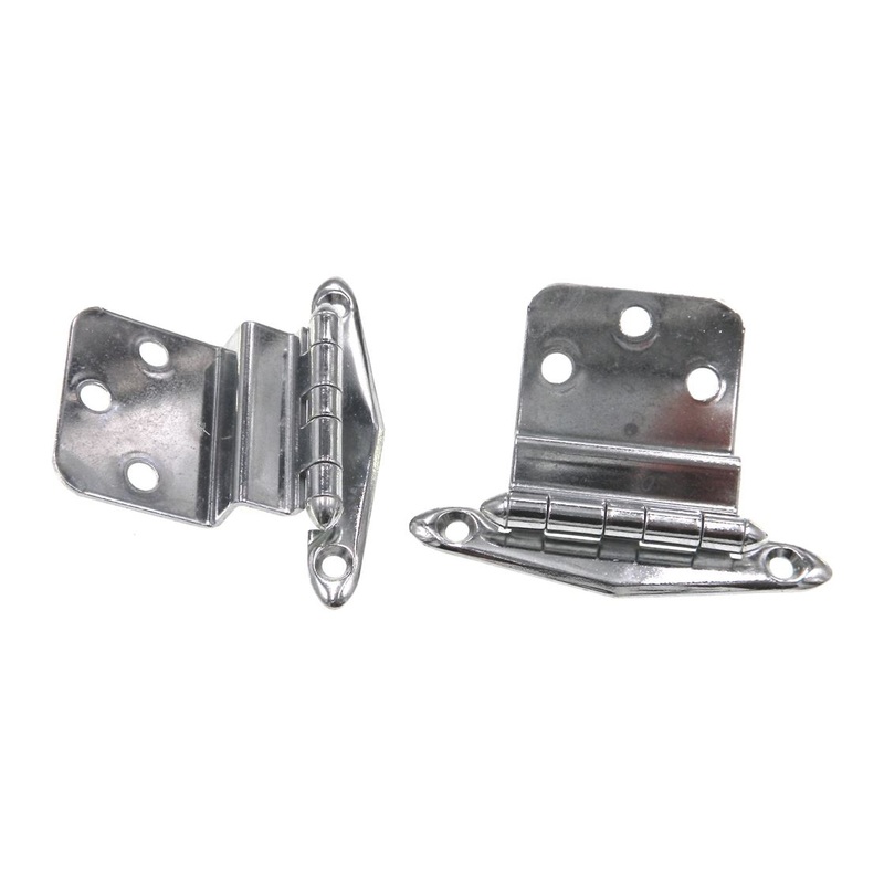 Set of 2 vintage Amerock Polished Chrome decorative face mount non self-closing cabinet hinges with 3/8" inset, model BP7675-26. This product does not come with the manufacturer warranty.Amerock Semi-Concealed Decorative HingePolished Chrome finish3/8 in.