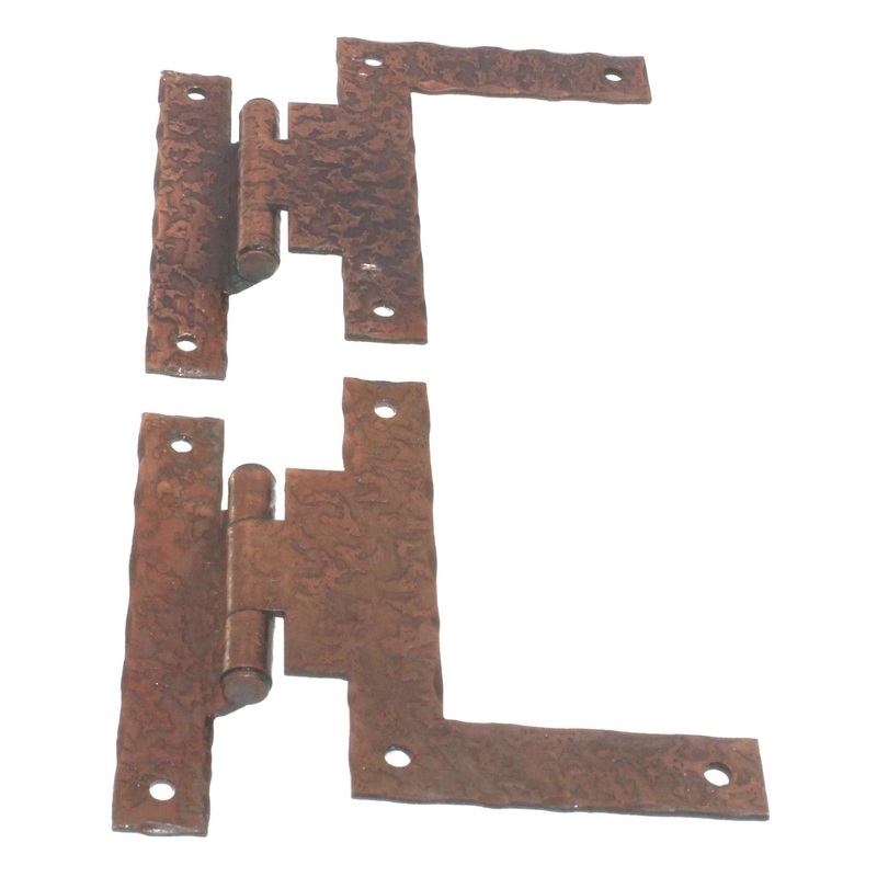 Set of 2 vintage Stanley Rustic Iron antique copper square hammered surface non self-closing "HL" hinges for 3/8" offset cabinet doors, model W858-3-8-D3.Stanley Rustic Iron "HL" hingeAntique Copper finishFor 3/8 in. offset doors"HL" wing measures 3 in. x