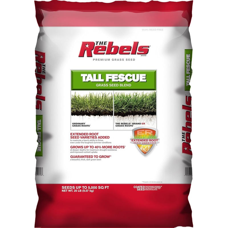 Pennington Rebel Tall Fescue Mixture Powder Coated Seed, 20 lb.The Rebels Tall Fescue grass seed is a tough, high quality turf grass that is designed to produce a beautiful lawn that can withstand heavy traffic, insects and drought. The Rebels Extended Roots seed varieties maximize a lawns ability to thrive, even under the toughest summer conditions. The Rebels Tall Fescue grass seed grows up to 40% more roots than ordinary grass at deeper depths for excellent drought resistance and nutrient uptake, helping your lawn thrive.Produces a darker, greener and denser lawn than Kentucky-31 and other tall fescuesA cool season, aggressive, perennial bunchgrass that develops a uniform, thick turf as it maturesMaintains a deep green color throughout the growing seasonProduct informationPlant or Animal Product Typegrass seedBrandPenningtonColorGreenExpected Blooming PeriodSummerItem Weight20.43 PoundsSunlight ExposureFull SunUnit Count320.0 OunceExpected Planting PeriodSummerMoisture NeedsModerate WateringUPC021496017488 021496013329Product Dimensions3.2 x 16 x 26 inchesItem Weight20.4 poundsManufacturerPenningtonItem model number100526883