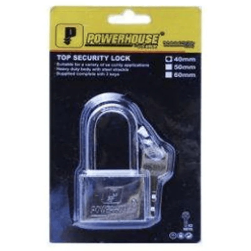 Powerhouse Top Security Padlock Long ShackleKeys non duplicatableAbloy style keys / round keysSizePrice30mm100.0040mm145.0050mm175.0060mm210.00Picture is for reference only. Actual item may vary.