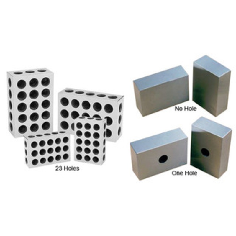 Precise Work Blocks/Set Up Blocks Heat-treated above 48 Rockwell "C". Cross drilling design for extra strength for minimum weight. Tapped holes are provided for clamping operations. .0001" to .0003" over allowance for nominal tapping squareness of all side