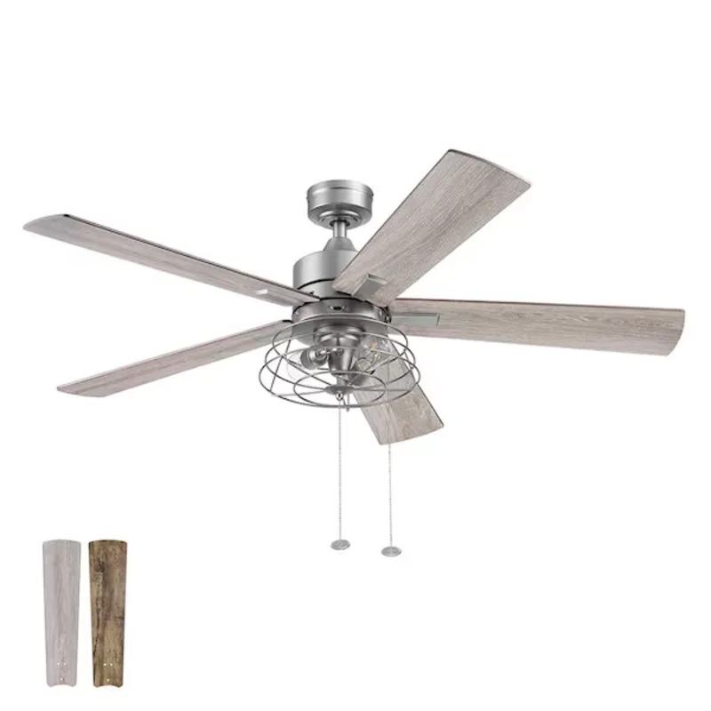 PROMINENCE HOME 51458-40 Marshall, 52 in. Ceiling Fan with Light, PewterProminence Home ceiling fans provide comfort for your home all year long but can also help to reduce energy costs. Enjoy the welcome breeze in any room of your home while looking stylish. This industrial style multi-position indoor ceiling fan combines stylish details of metal and wood for a truly inspiring fixture for your home. The Marshall features a cage inspired metal shade with LED Edison bulbs The innovative 5-blade design provides ultra-efficient, adjustable and energy efficient airflow while the LED lights provide ideal lighting to fit your mood. Control your ceiling fan with the traditional pull chain. Compatible with universal ceiling fan remotes. Enjoy year-round comfort by adjusting the reversible airflow switch that easily allows you to change the direction of the fan to properly distribute air. During hot summer months it will provide a cooling effect or when reversed, spreading warm air in the winter to help reduce energy costs. Specifications: Sizing: 52 inch 5-blade indoor fan for rooms up to 400 sq. ft. Lighting: 2 x E26/ST19 light bulbs included that provide 450 lumens, 4.5 watts, 2700k color temperature. About Prominence Home Ceiling Fans Prominence Home offers an assortment of decorative and functional ceiling fans in various sizes and specifications. Our goal is to ensure your choice of indoor or outdoor fan delivers optimum performance for your rooms size. All Prominence Home ceiling fans deliver maximum airflow with adjustable wind speeds. We design our products with high-quality materials that are durable and long-lasting. Whether youre building a new home or renovating your current space, trust Prominence Home ceiling fans to deliver a great look and last for years to come while fitting any budget.DimensionsLength52 inWidth52 inHeight16.98 inDetailsHousing ColorPewterVoltage120VMaterialMetal, Wood, GlassItemCeiling FanFeaturesReversible Motor, Tri-Mount Compatible, Dual-Finish Reversible Blades, LED Light