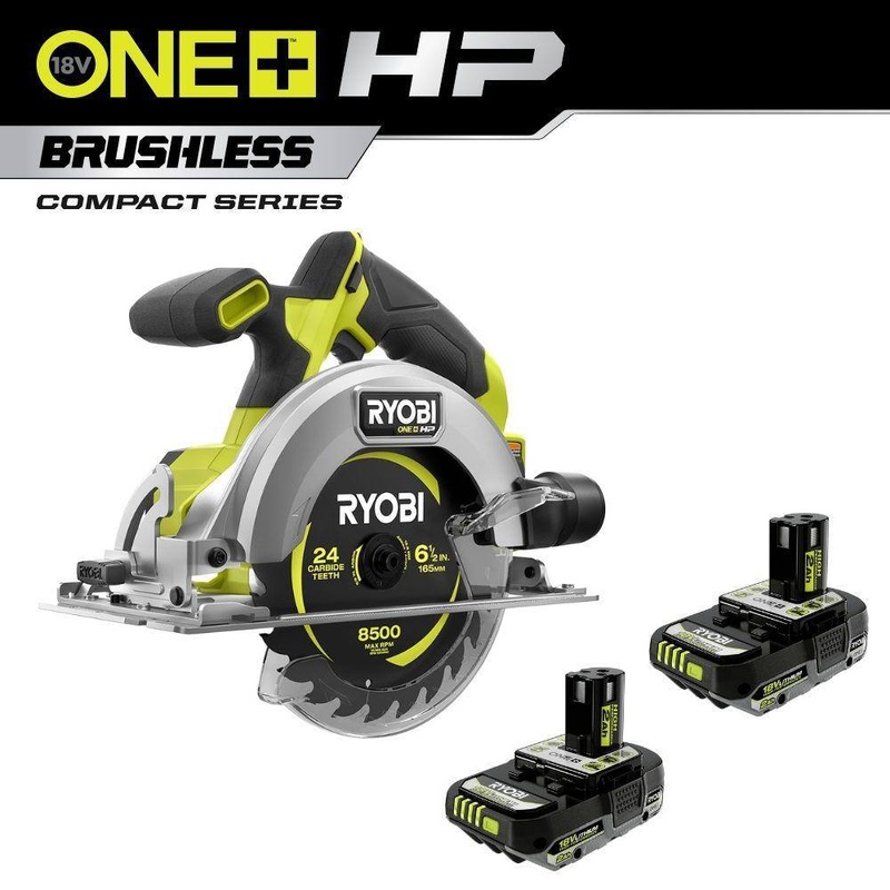 RYOBI PSBCS01B-PBP2003 ONE+ HP 18V Brushless Cordless Compact 6-1/2 in. Circular Saw with (2) 2.0 Ah HIGH PERFORMANCE BatteriesRYOBI introduces the 18V ONE+ HP Brushless Cordless Compact 6-1/2 in. Circular Saw with (2) 2.0 Ah HIGH PERFORMANCE Batteries. ONE+ HP Technology delivers more power, runtime, durability, and speed utilizing brushless motors, advanced electronics, and HIGH PERFORMANCE lithium technology. Our 6-1/2 in. circular saw is part of the Compact Series and is 25% lighter weight providing portability and ease of use. With 4,900 RPM, this saw provides 32% faster cutting and up to 350 cuts per charge to provide all day power. This compact circular saw offers users the ultimate cut versatility with an adjustable depth gauge that can cut up to 2-1/4 in. deep and can bevel 0 50. We upgraded the aluminum base to be lighter and more durable for even the toughest of jobs. Users have ultimate sight line visibility with the on-board LED worklight illuminating their cut with ease. The included batteries are compatible with all RYOBI 18V ONE+ Tools. Best of all, it is part of the RYOBI ONE+ System of over 280 Cordless Products that all work on the same battery platform. Backed by the RYOBI 3-Year Manufacturers Warranty, this ONE+ HP Compact Brushless 6-1/2 in. Circular Saw includes (1) Vacuum Dust Adaptor, (1) 24T Carbide Thin Kerf Blade, (1) Hex Wrench, two 18V ONE+ Lithium-Ion HIGH PERFORMANCE 2.0 Ah Batteries and an operators manual. Charger sold separately.Compact, ergonomic designONE+ HP technology delivers up to 4,900 RPMUp to 350 cuts per chargeAdjustable depth gauge for cutting up to 2-1/4 in.0 50 bevel capacityVacuum dust adaptor for cleaner work areaDurable, lightweight aluminum baseOn-board LED worklightThese RYOBI ONE+ 18V Lithium-Ion HIGH PERFORMANCE 2.0 Ah batteries provide up to 2X more runtime, 30% more power, and runs cooler compared to our standard lithium-ion batteries to provide long-lasting reliability and better performance in over 260 ONE+ toolsPerfect for any DIY or professional jobPart of the RYOBI 18V ONE+ System of Over 280 Cordless Products3-year manufacturers warrantyIncludes: (1) PSBCS01 18V ONE+ HP Compact Brushless 6-1/2 in. Circular Saw, (1) Vacuum Dust Adaptor, (1) 24T Carbide Thin Kerf Blade, (1) Hex Wrench, (2) PBP003 18V ONE+ Lithium-Ion HIGH PERFORMANCE 2.0 Ah Batteries, and Operators ManualCharger sold separatelyDimensionsBlade Diameter (in.)6-1/2 inProduct Depth (in.)11.75 inProduct Height (in.)10.5 inProduct Width (in.)6.5 in