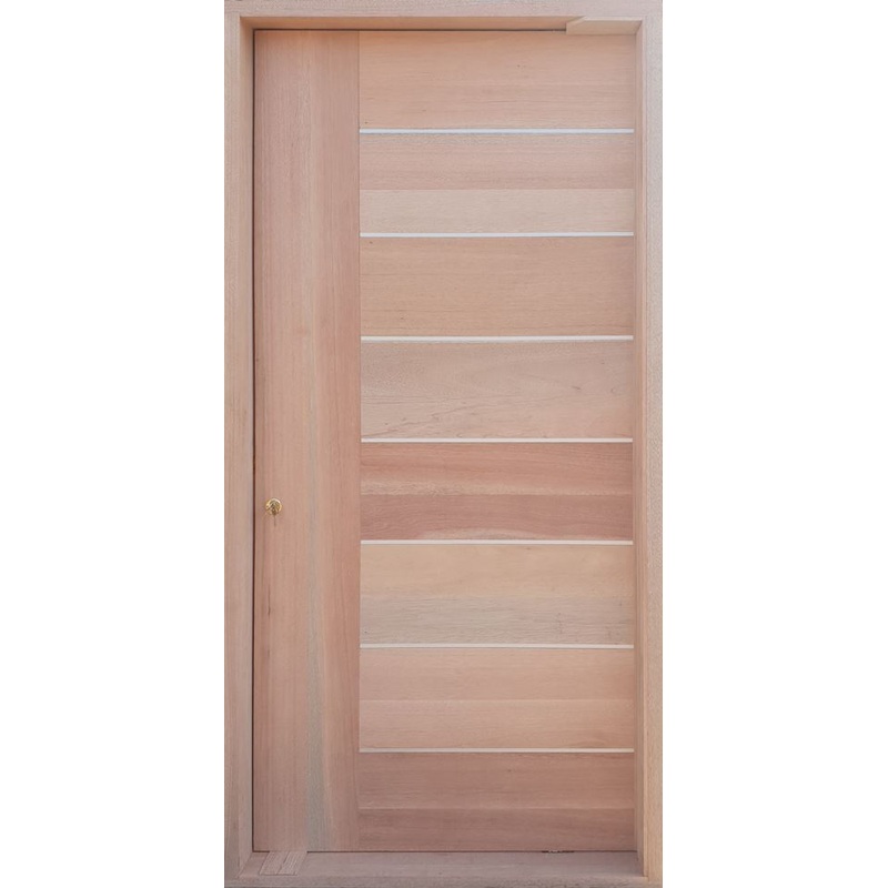 1200W X 2032H Semi SolidHorizontal SlattedPivot Doorwith Aluminium Inserts pre hung in the frame, Made from solid meranti 12mm thick slats and a centre skeleton with 2 concealed edges.FeaturesDecorative Aluminium Inserts in between horizontal slatsDoor is