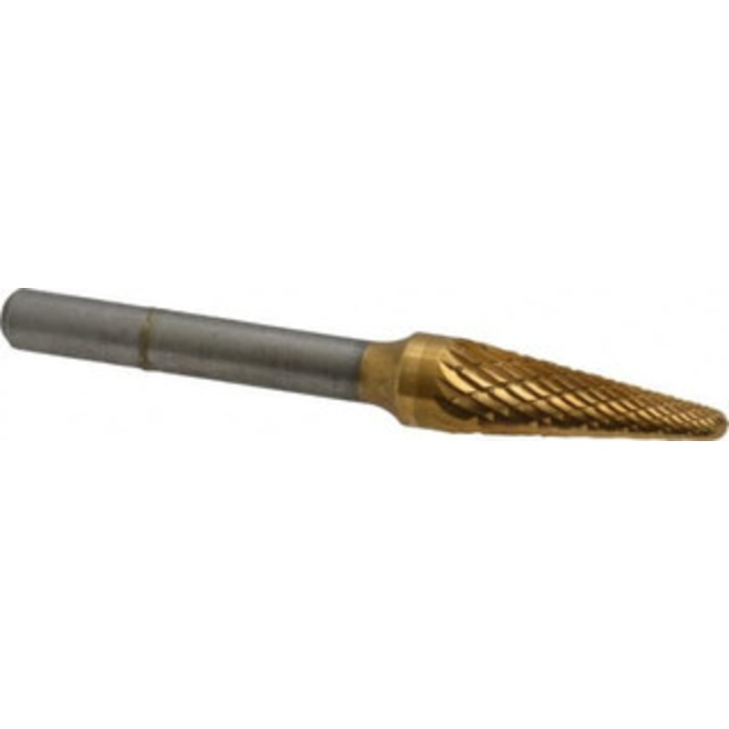SGSPRO 3/8 Cut Diam, 1/4 Shank Diam, 14 Carbide Double Cut Taper Burr Radius End, 2-13/16 OAL, 1-1/16 LOC, Titanium Nitride Finish 15245 – 01400977
