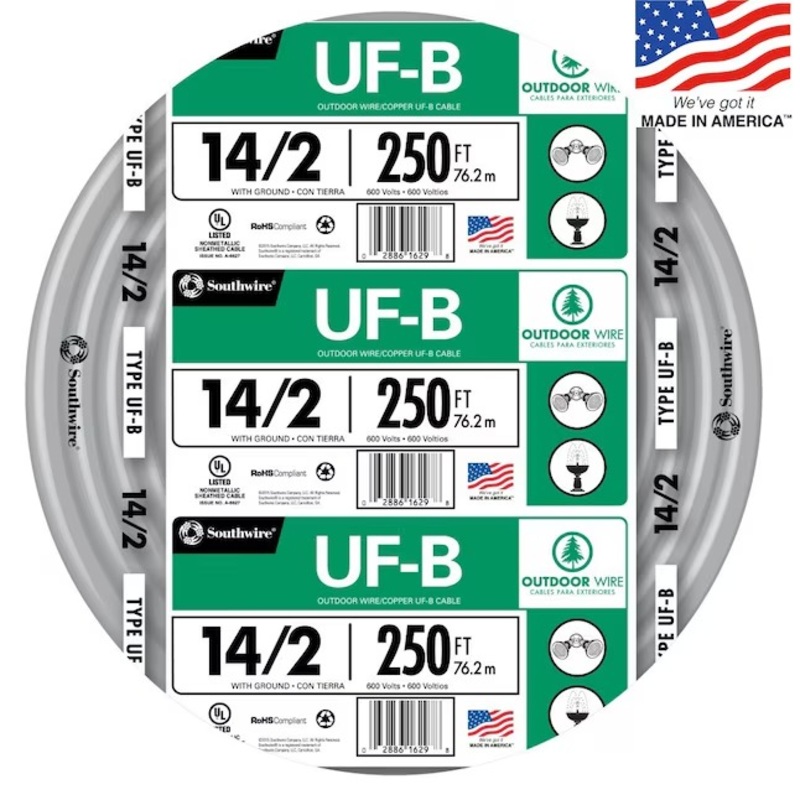 Southwire 13054255 250-Feet 14 / 2 Solid UF-B Wire W/G ( By-the-roll )Southwires copper UF-B cable is used in applications that include outside lamp posts, pumps and other loads. It can also be used for outbuildings such as garages and barns. UF-B feeds from a distribution point in an existing building. UF-B has a heat capacity of 90C and is rated at 600-Volt. UL Listed.Conductors are made of annealed (soft) copperPVC insulation and a nylon, color coded jacketUsed outdoors for direct burialUsed indoors for wet or corrosive locationsJacketed with sunlight, moisture and fungus resistant gray PVCGeneralSub-BrandN/ADimensionsCable Length (Feet)250Weight (lbs.)17.4093FeaturesCommercial/ResidentialCommercial/ResidentialShieldedNoDirect BurialYesStranded or SolidSolidFire ResistantNoUse LocationIndoor/OutdoorGround WireYesUV ResistantYesMaximum Amperage15Voltage Rating600Moisture ResistantYesWire Cut TypeBy-the-rollNumber of Conductors2Wire Gauge14RoHs CompliantYes