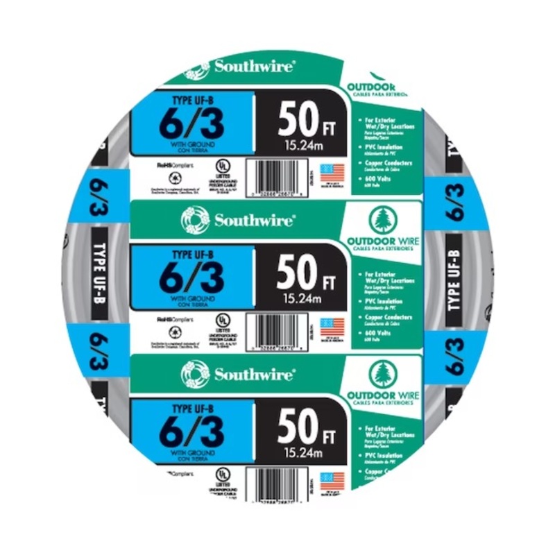 Southwire 14782722 50-Feet 6 / 3 Stranded UF-B Wire W/G ( By-the-roll )Southwire copper UF-B cable is used in applications that include outside lamp posts, pumps and other loads. It can also be used for outbuildings such as garages and barns. UF-B feeds fr