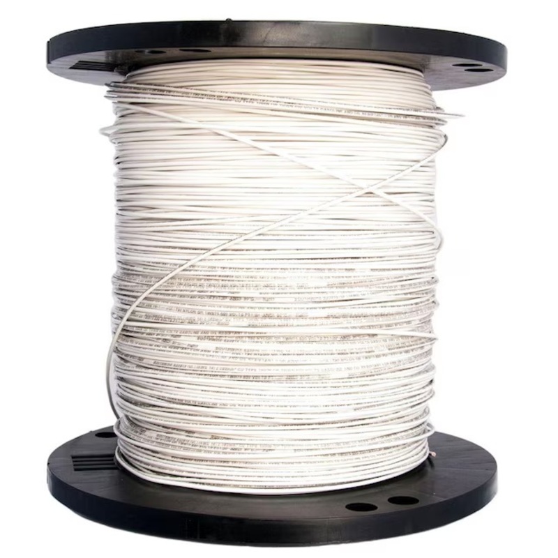 Southwire 22956706 2500-Feet 14 -AWG White Stranded Copper THHN wire ( By-the-roll )Southwires THHN conductors are primarily used in conduit and cable trays for services, feeders, and branch circuits in commercial or industrial applications.Branch, feeder and service power distribution in commercial, industrial, institutional and multi-residential buildingsConductor is suitable for use in dry locations at temperatures not to exceed 90CCopper conductors are annealed (soft) copper, compressed strand, insulated with a tough heat and moisture resistant polyvinyl chloride (PVC)Voltage for all applications is 600 voltsJacket is abrasion, heat, moisture, gasoline and oil resistantUL Listed and CSA certifiedGeneralJacket ColorWhiteTypeTHHN wireSub-BrandN/ADimensionsCable Length (Feet)2500FeaturesCommercial/ResidentialCommercial/ResidentialNumber of Strands19Conductor MaterialCopperRoHs CompliantYesDirect BurialNoShieldedNoFire ResistantNoUV ResistantNoInsulation MaterialPVC (polyvinyl chloride)Voltage Rating600Jacket MaterialPVC (polyvinyl chloride),Wire Cut TypeBy-the-rollMaximum Amperage15Wire Gauge14Moisture ResistantYesWire TypeStranded