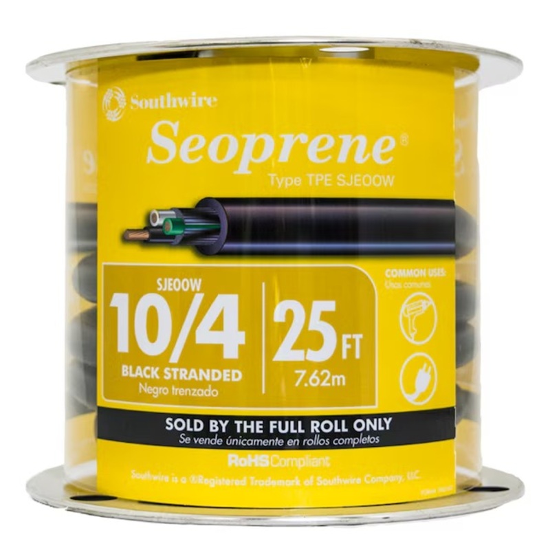 Southwire 55062804 25-ft 10-AWG 4 Black SJEOOW Power Cord By-the-rollTypical applications include wiring for industrial machinery, washing machines and various other large appliances, heavy duty tools, motors and temporary electrical power and lighting ins
