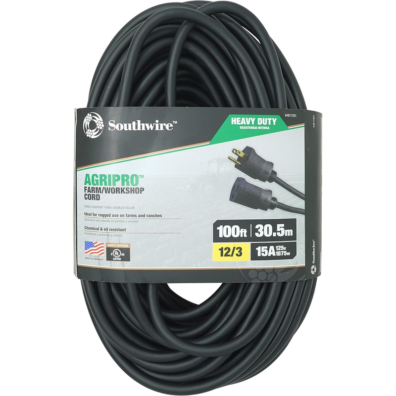 Southwire AGRIPRO 12/3 Heavy Duty Extension Cord, 100ft, Farm/Workshop Cord, SJTOW, Black, 64817201AgriPro 64817201 12/3 100-Foot Heavy-Duty 15 Amp SJTOW Farm/Workshop Extension Cord. Southwires newest AgriPro Cords are the perfect tough extension cords for farm; ranch and workshop jobs! These outdoor cords are highly resistant to chemicals and oils to survive life in a messy farm setting. They are rated for -58F to 221F (-50C to 105C); they are UL listed for your safety and have a limited life time .[MADE IN AMERICA][COLD WEATHER] Rated for -58F to 221F (-50C to 105C) AgriPro extension cords are ideal for farm; ranch and workshop jobs[HEAVY DUTY] 100 foot all-copper wire extension cord recommended for use with heavy duty equipment and tools[EXTRA DURABLE] oversized; molded plug prevent accidental bending or breaking and UL listed for your safety[OIL RESISTANT] Highly resistant to chemicals and oilsProduct informationTechnical DetailsManufacturerSouthwirePart Number64817201Item Weight12.89 poundsProduct Dimensions3.5 x 10 x 15 inchesCountry of OriginUSAItem model number64817201Size12/3 GaugeColorBlackStyle100 ftFinishBrushedMaterialBlendPatternExtension CordShapeRectangularPower SourceacVoltage120 VoltsWattage1.8E+3Item Package Quantity1Plug FormatType BIncluded ComponentsExtension CordBatteries Included?NoBatteries Required?NoWarranty DescriptionLimited Lifetime Warranty