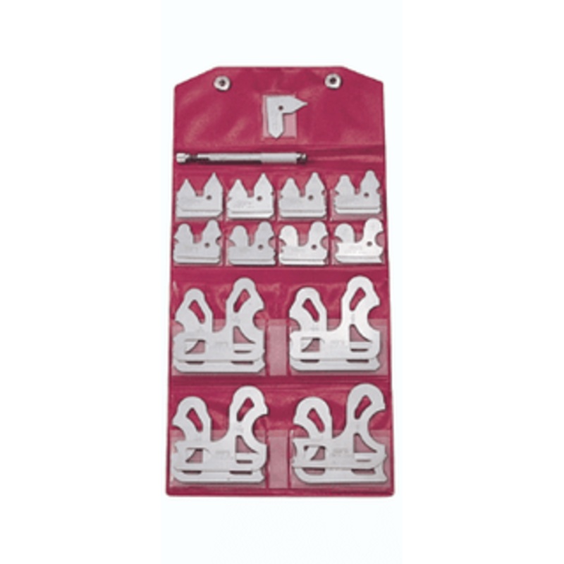 SPI Radius Gage Sets Made of rust-proof steel, satin chrome finish. Each gage is marked with its radius size. Each gage has 5 measuring surfaces for convex and concave radii. All sets furnished in vinyl case.