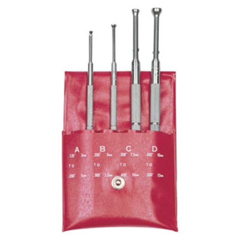 SPI Small Hole Gages: Flat Bottom Type Full radius measuring faces with flat bottom, ideal for measuring shallow holes, slots, grooves Size adjustment by knurled knob Final size is obtained by measuring over the contact points with a micrometer Gaging surf