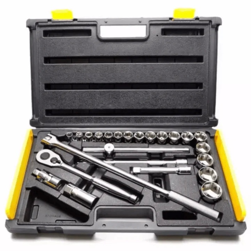 Stanley 86-589 1/2" Drive Socket Wrench Set 25pcs (10-32mm) 6pts25 pcs. Metric socket wrench set; 6 pts., (17 pcs sockets) 1/2" dr. X 10 - 32 mm includes: spark plug wrenchSocket flip drive ratchet, spinner, 10 sliding t-bar, polishedRatchet handle, 5 & 10