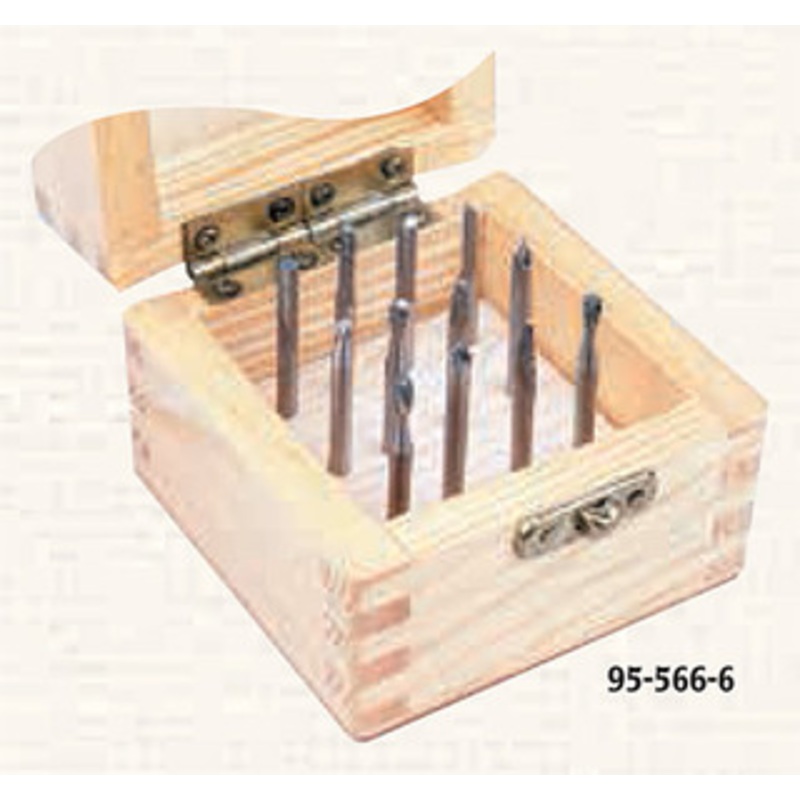 Steel Shank Solid Carbide Burr Set, 12 pc. - 95-566-6 Set95-566-6 Includes: 2 Cylindrical 2 Cylindrical Ball Nose 1 Ball 1 Egg 1 Round Tree Shape 1 Pointed Tree Shape 1 60 Cone 1 8 Included Angle 1 Flame Point 1 Inverted Taper and 1 wooden case See all Ste