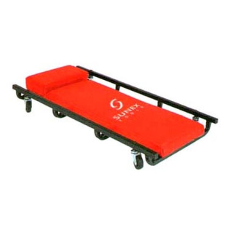 SUNEX 4 Caster Creeper Powder coated black frame Frame dimensions: 36" x 17" x 3.5" Cushioned red vinyl cover High quality casters for easy rolling Length (In.) 36 Caster Size (in.) 2.5 Max. Capacity: 250 lbs Ground Clearance: 1.75"
