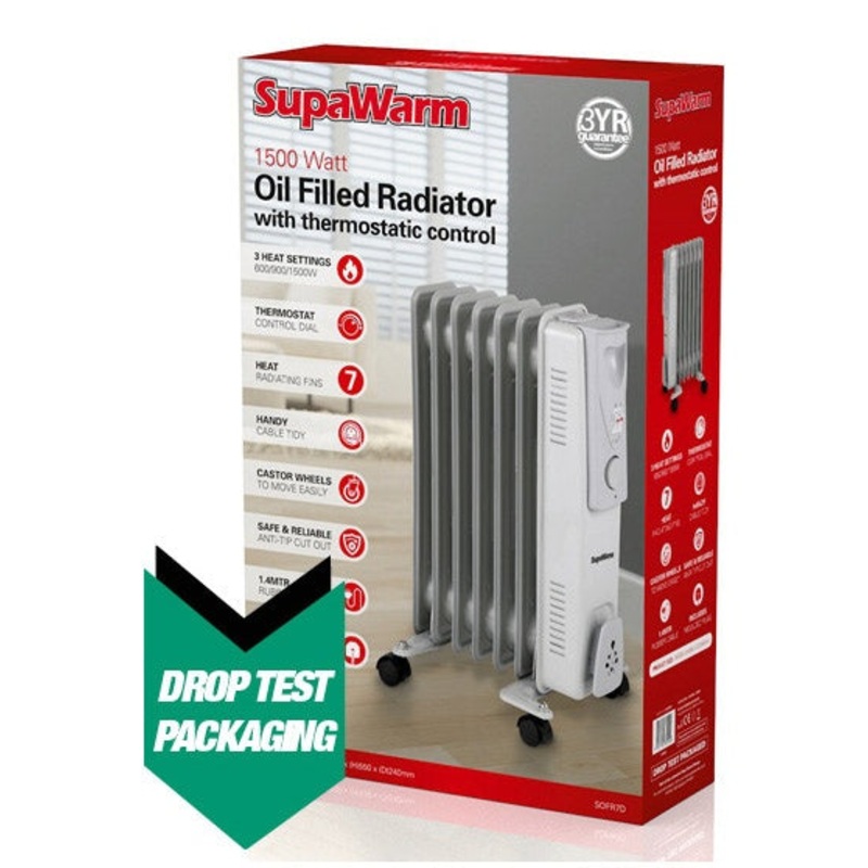 3 heat settings - 600/900/1500WThermostat control dial7 heat radiating finsHandy cable tidyCastor wheels to move easilySafe & reliable anti-tip cut out1.4mtr rubber cableIncludes moulded plugDrop tested packaging for safe transportation of the product in i