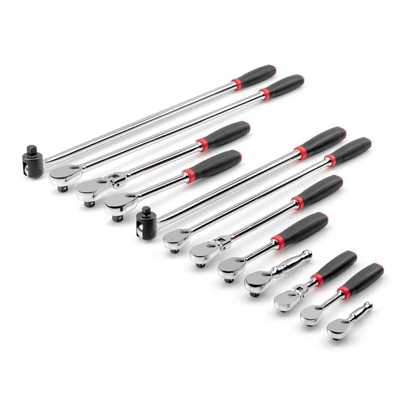 TEKTON SDR99006 1/4 in., 3/8 in., 1/2 in. Drive Comfort Grip Ratchet and Breaker Bar Set (12-Piece)With a 90-tooth gear that produces a working swing arc of just 4, TEKTON ratchets dont need much room to operate. Smaller than low profile, their ultra-compact heads are reduced in every dimension-height, width and length-allowing them to slip into tighter spaces than other ratchets. The polished exterior has a chrome plated finish thats corrosion-resistant and easy to wipe clean. TEKTON breaker bars give you the leverage and flexibility to reach and break free rusted or stuck nuts and bolts. The comfort grips rounded oval shape supports your palm and fingers when you push or pull.Ratchet requires a swing arc of just 4180, 9-position flex head lets you approach your work from any angleUnlike conventional low profile designs that focus on controlling only the thickness of the head, we reduced the size in every dimension: height, width and lengthClassic pull-release drive tang retains sockets with a spring-actuated detent ballBiased drive direction switch ensures the ratchet gear is engaged at all times, preventing slips or free-wheeling3-pieces, 1/4 in. drive comfort grip non-quick-release ratchets: 3 in., 6 in., 6 in. flex head4-pieces, 3/8 in. drive comfort grip non-quick-release ratchets: 4.5 in., 8 in., 12 in. flex head, 18 in.3-pieces, 1/2 in. drive comfort grip non-quick-release ratchets: 10.5 in., 14 in. flex head, 24 in.2-pieces comfort grip breaker bars: 3/8 in. drive x 18 in., 1/2 in. drive x 24 in.DetailsFeaturesNo Additional FeaturesHand Tool TypeRatchetIndividual/SetSetMeasurement StandardNo Measurement StandardNumber of Pieces12Tools Product TypeHand Tool