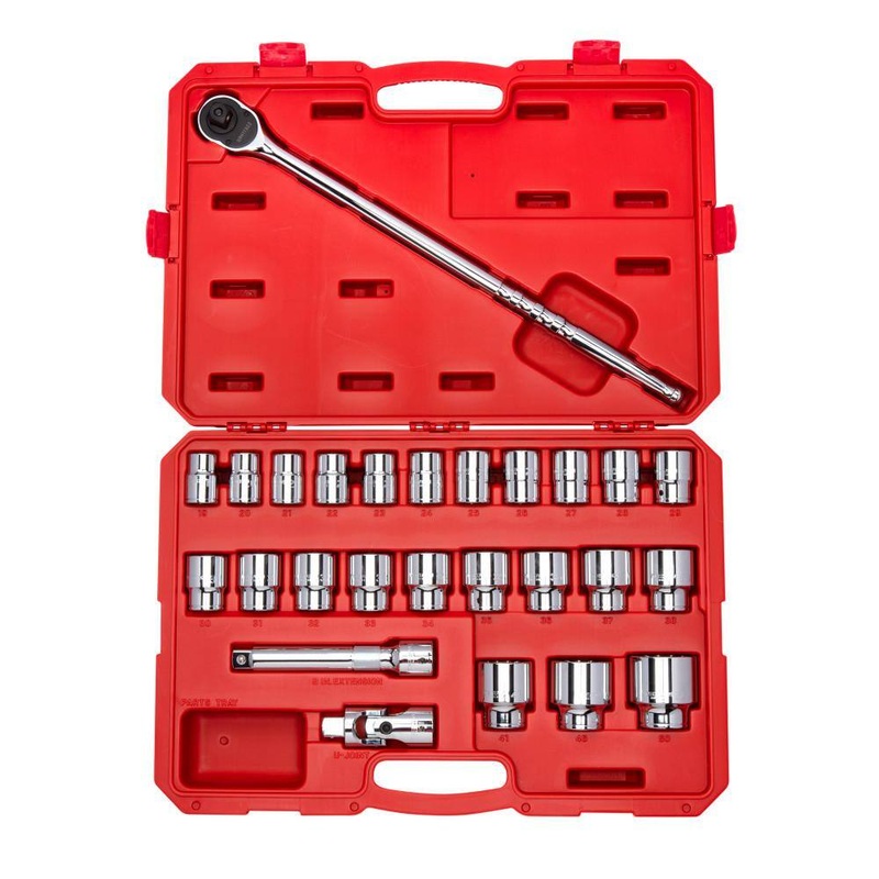TEKTON SKT35205 3/4 in. Drive 12-Point Socket and Ratchet Set 19 mm to 50 mm (27-Piece)The TEKTON 3/4 Inch Drive 12-Point Socket & Ratchet Set includes a range of socket sizes from 19 to 50 mm. The set comes equipped with a 72-Tooth quick-release ratchet as well as a universal joint and 8-inch extension, which arent often found in most sets. All of the tools come stored in a sturdy carrying case. The 12-point socket openings are an exact fit for double hex fasteners and also work with hex and square shapes.12-point sockets apply force to flat sides of fasteners and not the corners, preventing round-offExtra large die-stamped size marking is easy to read and cant wear offPolished, chrome-plated finish is easy to clean and highly resistant to corrosionFinely geared 72-tooth ratchet needs only a 5 working swing arcIncludes universal joint and 8 in. extension, tools not found in most sets23-piece 3/4 in. drive 12-point metric sockets: 19 mm, 20 mm, 21 mm, 22 mm, 23 mm, 24 mm, 25 mm, 26 mm, 27 mm, 28 mm, 29 mm, 30 mm, 31 mm, 32 mm, 33 mm, 34 mm, 35 mm, 36 mm, 37 mm, 38 mm, 41 mm, 46 mm, 50 mm1-piece universal joint: 3/4 in. drive1-piece 3/4 in. drive extension: 8 in.1-piece 3/4 in. drive quick-release ratchet: 22 in.1-piece storage caseDimensionsDrive Size3/4 in