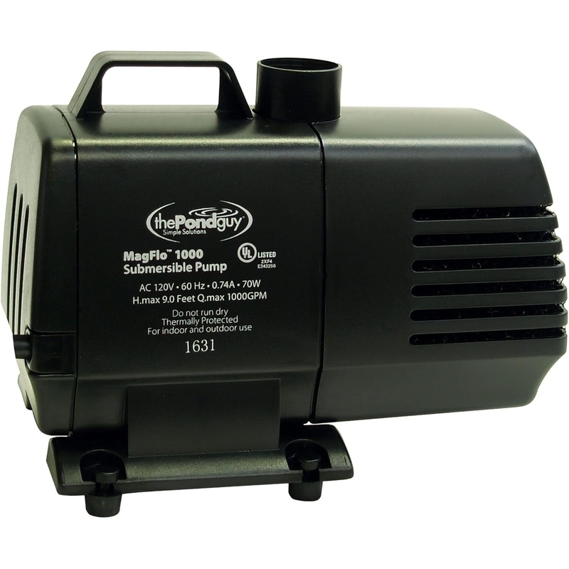The Pond Guy MagFlo High-Efficiency Compact Pump for Small Water Gardens, Quiet Multi-Purpose System for Waterfalls, Fountains or Spitters, 460 GPHCompact Multi-Purpose Pump The MagFlo high-efficiency water pumps are ideal for virtually any decorative pond project, from small water features to larger combined fountain and waterfall displays.High-Efficiency Pump is Ideal for Decorative Ponds Magnetic drive motor technology is energy efficient and simple to maintain. Available in a variety of sizes to best suit your water features.Versatile Pump Can Be Used in Three Ways Pump can power a waterfall, fountain, or a combo of both. Using the diverter you can run water and control flow to two water features at the same time.Includes Various Fountain Spray Patterns Multiple fountain heads are included to create diverse looks. The MagFlo Pumps versatile nature allows you to configure your pump setup in multiple ways.Removable Pre-Filter Reduces Maintenance Equipped with a large removable pre-filter for reduced pond maintenance. Near silent operation. Can be installed in-line. Includes a 20-foot power cord.Product informationBrandThe Pond GuyColorBlackMaterialStainless SteelStyleAbove GroundPower SourceAc/dcManufacturerThe Pond Guy, Inc.UPC811262011655Product Dimensions9 x 6 x 7 inchesItem Weight4.95 poundsItem model number120932