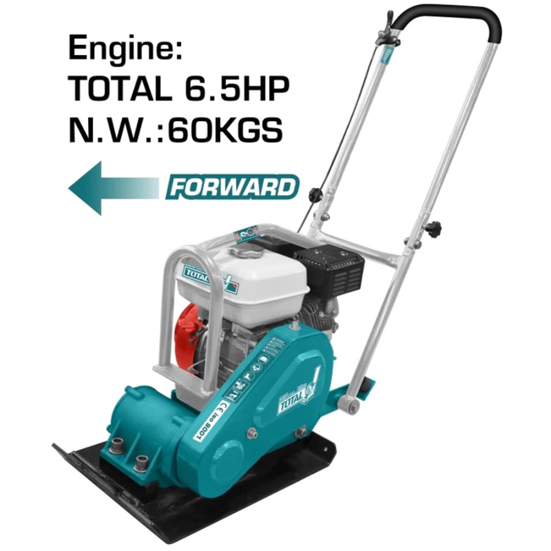 SpecificationsTOTAL Petrol EngineEngine power:4.8Kw(6.5HP)Weight:60KgsFrequency:5600VPMCentrifugal Force:10.5kNCompaction Depth:20cmTravel Speed:40cm/sEfficiency:450M2/HrPlate size:50x36cm