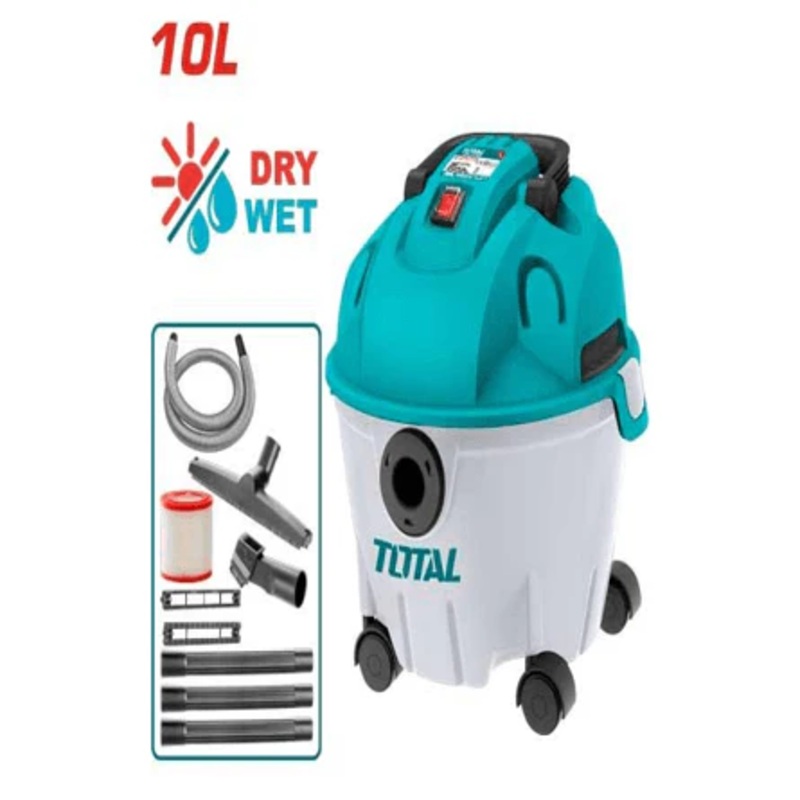 Total TVC12101 Vacuum Cleaner 1200W (10L)Voltage: 220V-240V~50/60HzInput power:1200WDust capacity:10LVacuum pressure: 15KPaWet and dry cleaningHepa filterAir flow:1.35m/minProduct size:321*346*350mmWith thermo fuse1.5m flexible hose1pcs HEPA1pcs wet & dry