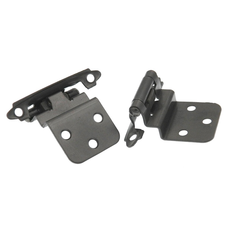 Pair of Ultra Hardware Dark Antique Pewter Face Mount Self-Closing, 3/8" Inset Hinges 34909Antique Pewter FinishFace Mount3/8" Inset Self-ClosingOverall Height: 2 3/4" with 2 1/8" Hole Centers