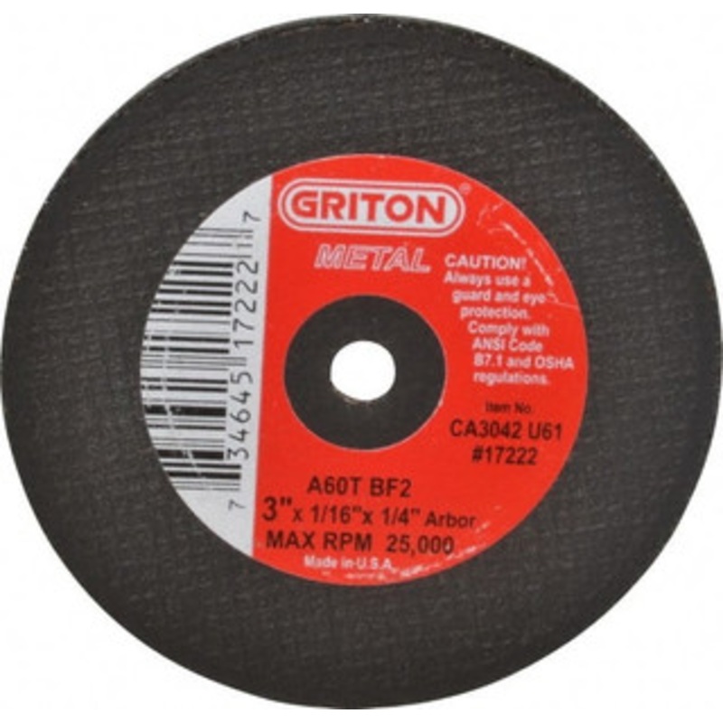 Value Collection 3 x 1/16, 1/4" Hole 60 Grit Aluminum Oxide Cutoff Wheel Medium Grade, Reinforced, 25,000 Max RPM, Use with Die GrindersManufacturer Part #: CA3042U61S/N: 01102607UNSPSC: 23131503(Minimum Order Quantity=1, Package Quantity=1)Specifications:
