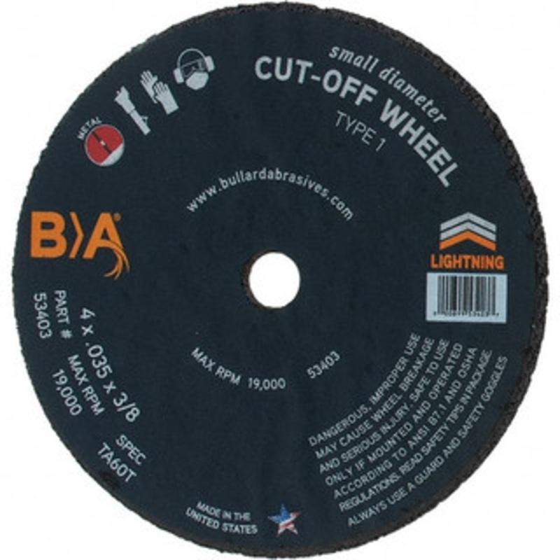 Value Collection 4 x 0.035, 3/8" Hole Aluminum Oxide Cutoff Wheel 19,000 Max RPMManufacturer Part #: BD3025S/N: 64707169UNSPSC: 23131503(Minimum Order Quantity=25, Package Quantity=1)(Please order in multiples of 25)Specifications:Wheel Diameter (Inch)4Whe